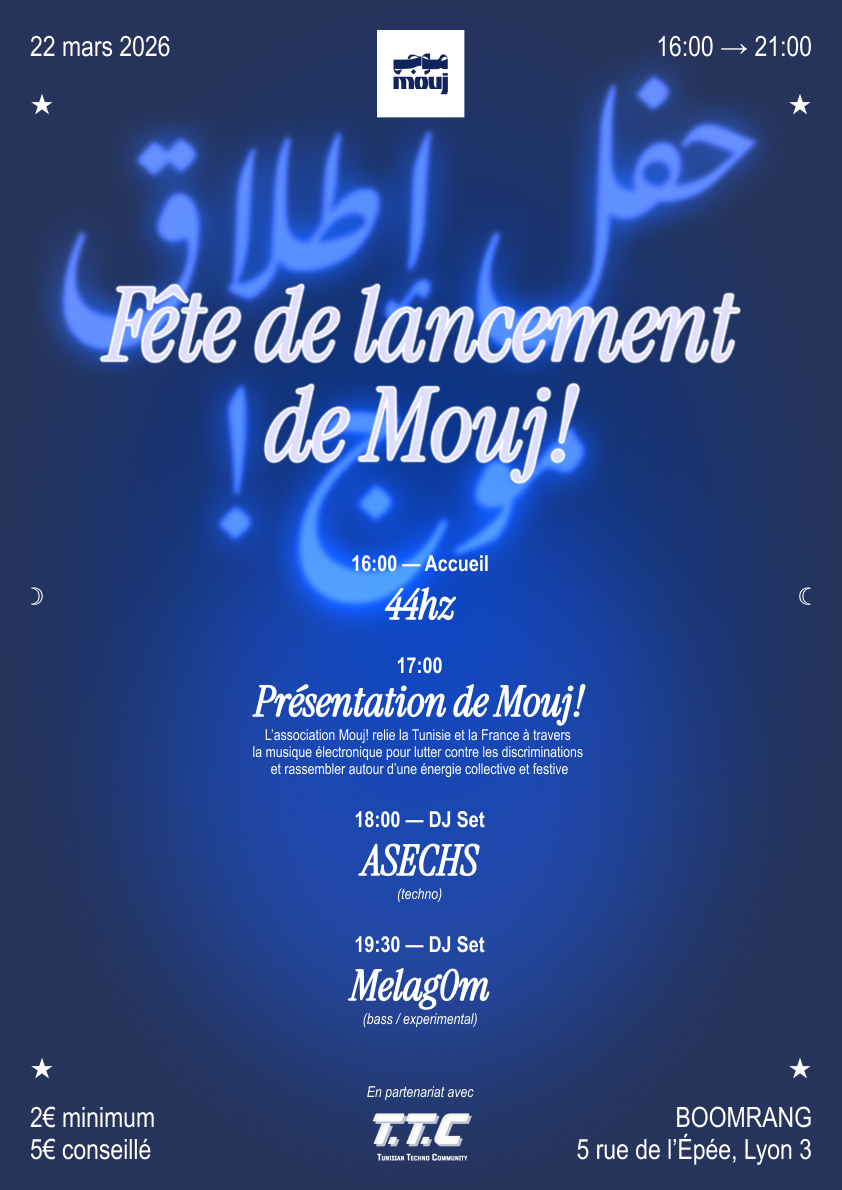 L’association Mouj! (“la vague” en tunisien) est un projet culturel et militant qui vise à bâtir des liens entre la Tunisie et la France grâce à la musique électronique. Face à la montée des discours identitaires et discriminants, elle utilise la culture comme levier pour lutter contre les préjugés et le racisme, en défendant des valeurs de tolérance, d’égalité et d’entraide. Mouj! développe un réseau d’artistes et d’acteurs de la scène électronique entre les deux pays, accompagne de jeunes artistes et organise des événements ainsi que des temps d’échange entre les deux rives de la Méditerranée. Il ne s’agit pas seulement de faire réfléchir, mais aussi de faire vibrer, de mobiliser et de rassembler autour d’une énergie collective, festive et engagée.